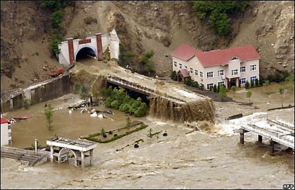 Nước từ hồ Đường Gia Sơn, vốn hình thành sau trận động đất Tứ Xuyên, đã tràn vào thị trấn Bắc Xuyên.