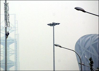Cho dù khói bụi, một nhà hoạt động táo bạo đã leo lên một cột điện để treo biểu ngữ 'Tây Tạng tự do' gần sân vận động Tổ Yến. |