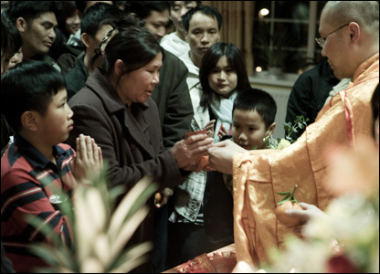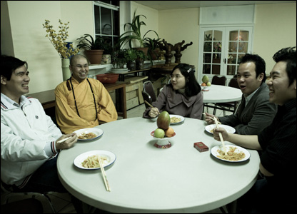 Du học sinh từ nhiều thành phố ở Anh Quốc cũng rủ nhau về chùa trong dịp Tết cổ truyền. Bữa ăn tất niên tràn ngập tiếng cười cùng sư thầy phần nào giúp họ vơi bớt nỗi nhớ nhà...