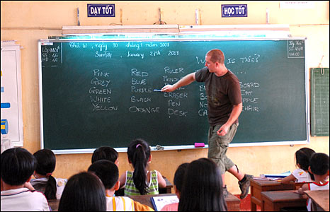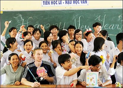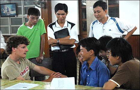 Sinh viên Dan (người Anh) dạy tiếng Anh cho học sinh trường Thủ Khoa Huân -TP Mỹ Tho.