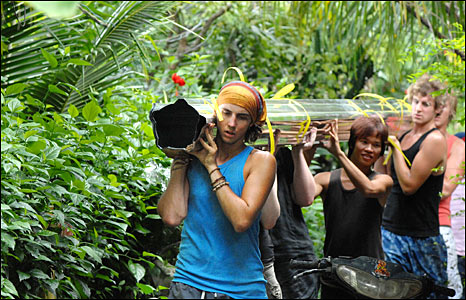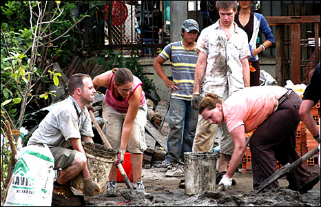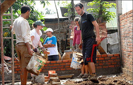 Những thanh niên tình nguyện đến từ nước Anh đang trộn hồ xây dựng nhà cho một hộ nghèo ở phường 2, thành phố Mỹ Tho, Tiền Giang.
