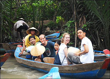 Ngoài công việc tình nguyện, họ còn cùng với học sinh, thanh niên địa phương tìm hiểu về vùng nông thôn sông nước, sinh thái ở cồn Thái Sơn, huyện Châu Thành, Tiền Giang.