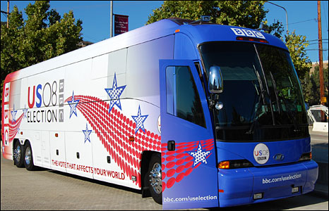 Đây là chiếc xe bus sẽ chở các phóng viên của BBC đi tìm hiểu nước Mỹ nhân dịp chuẩn bị bầu cử Tổng thống. Chiều 9/9, tôi được gọi về họp mặt tại Los Angeles để chuẩn bị bắt đầu hành trình vào hôm sau.