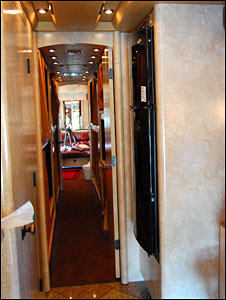 Hành lang dẫn từ khoang trước tới khoang sau của xe bus. Chiếc xe bus này có thiết kế nội thất rất hiện đại, với các màn hình rộng, sofa cho phóng viên ngồi, internet không dây (mặc dù sau đó tôi mới phát hiện tốc độ rất chậm).