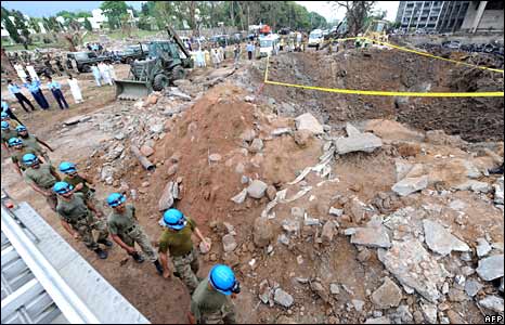Hố bom có đường kính 6m trong ánh sáng ban ngày. Chuyên gia nói rằng khách sạn bị tấn công bởi chiếc xe chở tới một tấn thuốc nổ.