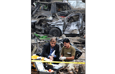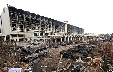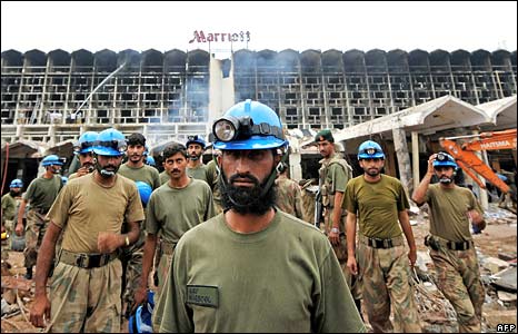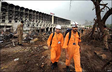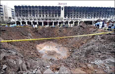 Xe tải chở bom đánh khách sạn lúc 8 giờ tối thứ Bảy. Marriott là khách sạn nơi người ngoại quốc và giới giàu sang Pakistan tụ hợp. Ít nhất 50 người bị thiệt mạng và hàng trăm người khác bị thương.