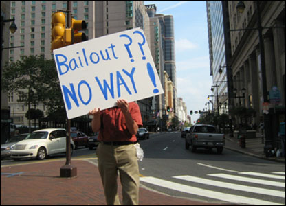 Một người mang biểu ngữ chống đạo luật cứu nguy kinh tế "bailout" trước tòa thị chính Philadelphia.