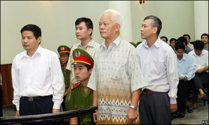 Từ trái sang, thượng tá Đinh Văn Huynh bị kết án 1 năm tù, nhà báo Nguyễn Văn Hải nhận 24 tháng cải tạo không giam giữ, thiếu tướng Phạm Xuân Quắc bị cảnh cáo tội "cố ý làm lộ bí mật công tác", trong khi nhà báo Nguyễn Việt Chiến chịu 2 năm tù giam.
