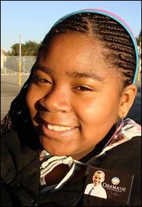 Một cô gái da đen mang huy hiệu có hình tân Tổng Thống Obama cười vui sau khi xem lễ nhận chức đầy tính lịch sử.