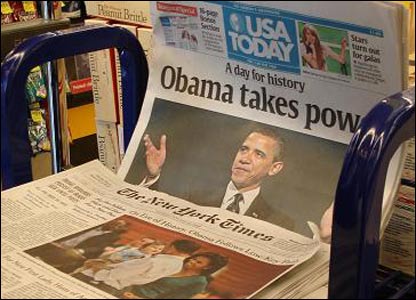 Báo chí phát hành toàn quốc ngày 20.1 dành trang nhất nói về ngày lịch sử khi một người da đen lần đầu tiên lên làm Tổng Thống Hoa Kỳ.