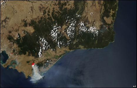Hình ảnh này, do Nasa cung cấp, cho thấy khói bay lên từ các khu rừng ở bang Victoria. Các bang New South Wales và South Australia cũng có cháy rừng.