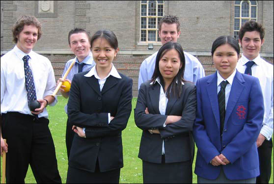 Từ trái sang, Hồ Thị Như Mai, Nguyễn Lan Tâm và Đoàn Anh Trà chụp cùng các sinh viên Anh tại trường Rossall ở Lancashire thuộc vùng Tây Bắc nước Anh