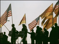 Bạn nói :"Nếu họ đem lá cờ này về VN thì họ cũng khó sống mà trở về xứ sở tại thì xin cũng đừng hỏi tại sao họ ngược đãi những người mang lá cờ đỏ sao vàng sang xứ của họ sống". Quả thật tôi không hiểu quốc gia bạn sống còn luật pháp nữa hay không? VN và HK đã thiết lập quan hệ ngoại giao, vậy thì đem cờ tổ quốc vào quốc gia khác là hoàn toàn hợp pháp, cũng như chẳng ai có ý kiến khi đem cờ Mỹ vào VN, còn cờ 3 sọc, có được quốc gia nào công nhận chăng? Phải chăng bạn đang lẫn lộn giữa cờ 3 sọc và lá cờ Hoa Kỳ? Còn về việc bạn nói trưng cầu dân ý tại VN, có lẽ khỏi bàn vì bạn chẳng hiểu gì về VN cả...
