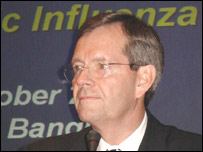 Theo họ, nếu như đại dịch đó xảy ra, nó có thể cướp đi sinh mạng của ít nhất 5 triệu người. Trong khi đó, ngày hôm nay, một quan chức tại bệnh viện Sulianti Saroso ở thủ đô Jakarta của Indonesia tuyên bố lại có thêm một người nữa tử vong vì bị nghi là nhiễm virus cúm gia cầm. Tuy nhiên, họ vẫn chưa có được kết quả kiểm tra chính thức. Ngoài ra Indonesia còn có hai trường hợp bệnh nhân được khẳng định là lây nhiễm cúm gia cầm. Hôm nay, Bộ trưởng Y tế Indonesia, Siti Fadillah Supari, còn tuyên bố sẽ phải học hỏi từ Việt Nam cách kiềm chế cúm gia cầm. Khi gặp Bộ trưởng Y tế Việt Nam Trần Thị Trung Chiến, bà Siti nói rằng VN "cũng có nguồn lực hạn chế như chúng ta mà họ lại có khả năng ngăn chặn cúm gia cầm". Việt Nam tuyên bố từ tháng Bảy đến giờ không có các ca lây nhiễm mới ở người. Tuy thế, WHO Hà Nội tiếp tục khuyến cáo khả năng bùng phát cúm gia cầm vẫn có thể xảy ra bất cứ lúc nào. Bộ trưởng Y tế Mỹ Michael Leavitt hối thúc các quốc gia phải tự có các biện pháp kiểm soát, vì theo ông, ngay cả Hoa Kỳ cũng không có khả năng sản xuất đủ vaccine cho toàn bộ dân số trong nước. Dịch cúm gia cầm đã giết chết ít nhất 60 người tại các quốc gia Đông Nam Á. | |||||||||||||||||||||||||||||||||||||||||||||||||||||||||||||||||||||||||||||