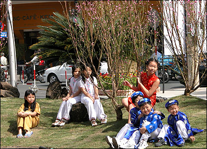Trẻ em Việt Nam với trang phục cổ truyền ngồi chơi trên cỏ