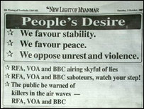 Khi bạn tới Miến Điện, bạn sẽ nhận thấy rõ chính phủ đang ra sức thuyết phục mọi người rằng mọi thứ đã trở lại bình thường. Truyền thông ra rả đưa tin về các cuộc tụ tập, nơi hàng trăm người bày tỏ sự ủng hộ đối với chính phủ quân phiệt.