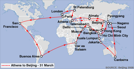 Các rào chắn đã được dựng lên dọc tuyến đường kéo dài chừng 10km và hàng ngàn người đã theo dõi sự kiện này. Hai người đã bị chặn, không cho chăng biểu ngữ. Tuy nhiên, phóng viên BBC có mặt tại chỗ nói sự kiện đã diễn ra tương đối tốt đẹp. Đã có các cuộc biểu tình lớn khi đuốc được rước tại San Francisco, Paris và London quanh việc Trung Quốc xử lý tình hình Tây Tạng trong thời gian vừa qua. Phóng viên BBC Andrew Harding tại Bangkok nói đã có cuộc xô xát ngắn trong vài giây ngay từ lúc bắt đầu lễ rước đuốc, khi một người Thái và một người nước ngoài ủng hộ Tây Tạng tìm cách chăng biểu ngữ. Anh nói biểu ngữ đã nhanh chóng bị một nhóm người Trung Quốc vây quanh tước khỏi tay hai người này. Các quan chức Thái Lan nói tuyến đường đi từ khi Phố Tàu tới Royal Plza, dự kiến mất ba giờ đồng hồ, có thể sẽ được thay đổi để cắt ngắn vào phút chót. Phó thủ tướng Sanan Kachornprasart là người đầu tiên trong số 80 người bắt đầu chạy từ khu Phố Tàu. Đuốc và các thành viên tham gia rước đuốc được đoàn xe mô tô cảnh sát hộ tống trên suốt dọc tuyến đường. Đuốc sẽ được rước qua Indonesia, Úc, Nam Hàn, Nhật Bản và Việt Nam trước khi tới Bắc Kinh để được thắp tại Thế Vận Hội vào tháng Tám tới đây.