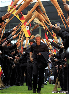Huấn luyện viên trưởng Juergen Klinsman bước qua hàng chào của những người quét ống khói để lấy hên.