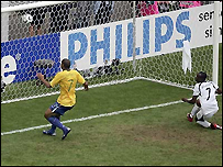 Phút 42, Brazil hưởng phạt góc, tiền đạo Asamoah Gyan không bị ai kèm đã nhảy lên đánh đầu hiểm hóc, nhưng bóng lại bật đúng chân thủ môn Dida dù rằng thủ thành này đã hoàn toàn bó tay.