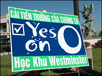 Hoặc như Measure O, cho phép Học Khu Westminster mua công khố phiếu trị giá $130 triệu, cũng được ghi bằng tiếng Việt trên nhiều bảng quảng cáo ở đại lộ Bolsa là “Cải tiến trường của chúng ta, yes on O, Học Khu Westminster.”