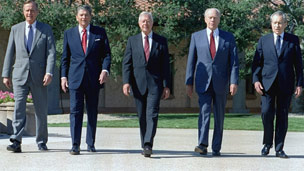 Trong hình các cựu tổng thống: George H Bush, Ronald Reagan, Jimmy Carter, Gerard Ford và Richard Nixon nay chỉ có hai ông Bush và Carter còn sống