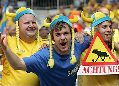Những cổ động viên này của Thụy Điển mang theo biển cảnh báo đội Đức trước khi trận đấu diễn ra trên sân Munich