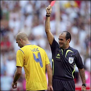 Trọng tài Carlos Eugenio Simon cười hiền lành khi giơ thẻ đỏ đuổi Teddy Lucic ra khỏi sân, sau khi anh nhận thẻ vàng thứ hai trong trận đấu