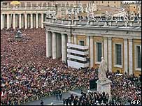 Trước đó một làn khói trắng đã bay lên từ ống khói Nhà nguyện Sistine và tiếng chuông rung báo hiệu Hồng y đoàn đã lựa chọn được người kế nhiệm Đức Giáo hoàng John Paul II.