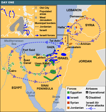 Vào hồi 0745 giờ Israel, Israel tiến hành chiến dịch Focus và làn sóng những đợt không tập đầu tiên của Israel nhắm vào 11 sân bay của Ai Cập đã phá hủy hàng chục phi cơ đang đậu trên đường băng.