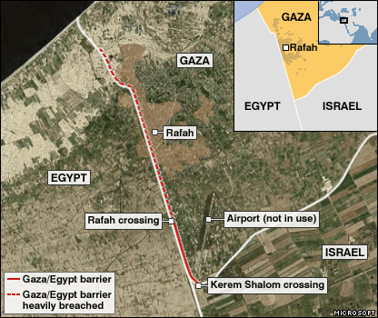 Cảnh sát chống bạo động của Ai Cập đã sử dụng vòi rồng để ngăn những người đang cố gắng vượt qua biên giới để lọt vào Ai Cập. Ai Cập công bố biên giới sẽ được đóng cửa vào lúc 13h00 (giờ GMT). Hàng trăm nghìn người Palestin đã băng qua biên giới Ai Cập để mua các hàng hoá nhu yếu phẩm kể từ khi các du kích quân làm vỡ một số lỗ thủng lớn ở biên giới Ai Cập hôm thứ Tư. Israel đã yêu cầu Ai Cập hành động vì nước này lo lắng về khả năng xảy ra các vụ mua bán vũ khí. Trong suốt đêm thứ Năm, quân đội Israel đã tiến hành hai vụ không kích gần biên giới, giết chết bốn người tình nghi là du kích quân Hamas. Các bác sĩ Palestin cho biết chỉ huy phái quân sự thuộc phong trào Hồi giáo tại Rafah, Mohammed Abu Harb, đã bị giết cùng với một chỉ huy du kích quân cao cấp khác khi các hoả tiễn của Israel bắn trúng chiếc xe díp của họ trong thành phố. Hai thành viên khác của nhóm du kích quân vốn đã kiểm soát Gaza vào tháng Sáu năm ngoái đã bị giết chết trước đó hai giờ đồng hồ, trong một vụ không kích của Israel vào một xe tải ở miền nam Rafah. Israel đã giết chết hơn 40 người Palestin ở Gaza trong 10 ngày qua cùng với việc thắt chặt phong toả vùng đất dọc bờ biển mà các du kích quân Palestin vẫn sử dụng để phóng hoả tiễn vào quốc gia Do Thái này. Liên hiệp quốc đã đưa ra con số tính toán rằng hơn 1,5 triệu người ở dải Gaza đã vượt qua biên giới Ai Cập từ ngày thứ Tư. Khu phố chính trên đất Ai Cập đã biến thành một chợ trời khổng lồ bán tất cả các loại hàng hoá, bao gồm nhiên liệu, dê, các con vật nuôi khác, các loại hàng hoá và thuốc lá.