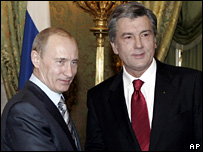 Tổng thống Yushchenko nói rằng ông nhận thấy có một số "vấn đề tế nhị" đã xuất hiện từ khi Ukraina có ý định gia nhập NATO, tuy nhiên ông hy vọng rằng các vấn đề này có thể được giải quyết qua bàn đàm phán một cách thẳng thắng và tín nhiệm lẫn nhau. Ông Yushchenko nói "bất cứ một ai cũng thấy rằng một việc dù nhỏ nhoi đến đâu trong việc tham gia vào hệ thống lá chắn, dứt khoát không có chủ đích nhắm vào một nước thứ ba, nhất là Nga". Trong bài phát biểu đọc trước Hội Đồng Nhà Nước Nga hồi tuần qua, ông Putin đã cảnh báo rằng có "một giai đoạn mới trong cuộc chua đua võ trang trên thế giới". Ông nói rằng các nước khác chi tiêu nhiều hơn nước Nga trong việc phát triển các võ khí mới, nhưng nước Nga sẽ đáp trả lại cuộc chạy đua võ khí này bằng cách phát triển các võ khí kỹ thuật cao. Tranh chấp dầu khí Tổng thống Ukraina Viktor Yushchenko trước đó đã hội đàm với Tổng thống Nga Vladimir Putin nhằm dàn xếp việc tranh cãi xung quanh một yêu cầu của Tập đoàn khí đốt độc quyền Gazprom của Nga. Tập đoàn này đòi Ukraina chi trả cho mình 1,5 tỉ USD. Nga đe doạ sẽ ngừng cung cấp khí đốt nhưng Kiev đã tranh luận về khoản hoá đơn nói trên.