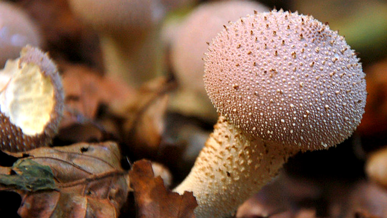 The common puffball or devil's snuff-box is a moderate-sized puffball mushroom covered in short spiny bumps or 'jewels'. Image by Gale.