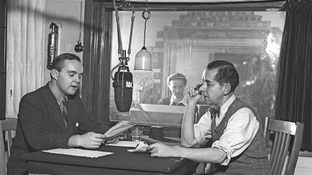 1943. A BBC European Service studio broadcast, with presenter John Foreman and producer Lionel Gamlin. The programme engineer can be seen in the cubicle behind the studio.