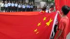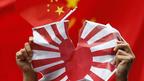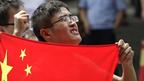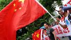 • 一名抗议者在日本驻北京使馆前举起中国国旗。