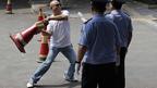 • 在日本驻北京使馆前,一名抗议者试图向使馆投掷锥型交通路障,被警察拦住。