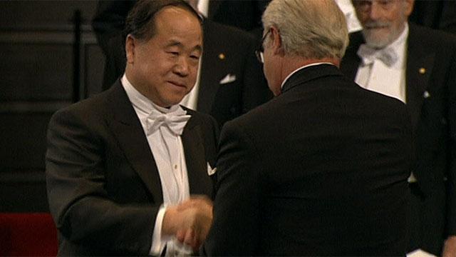 中國作家莫言12月10日接受諾貝爾文學獎。他由瑞典作家兼文學委員會主席帕·瓦斯特伯格介紹出場,然後從瑞典國王古斯塔夫手中接過獎金和證書。